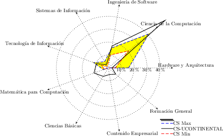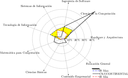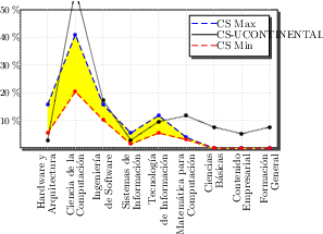 Considerando esta distribución, las figuras [*] a la [*] nos permiten tener una visión gráfica de esta malla curricular frente a las propuestas de carreras presentadas por IEEE-CS/ACM en la Computing Curricula